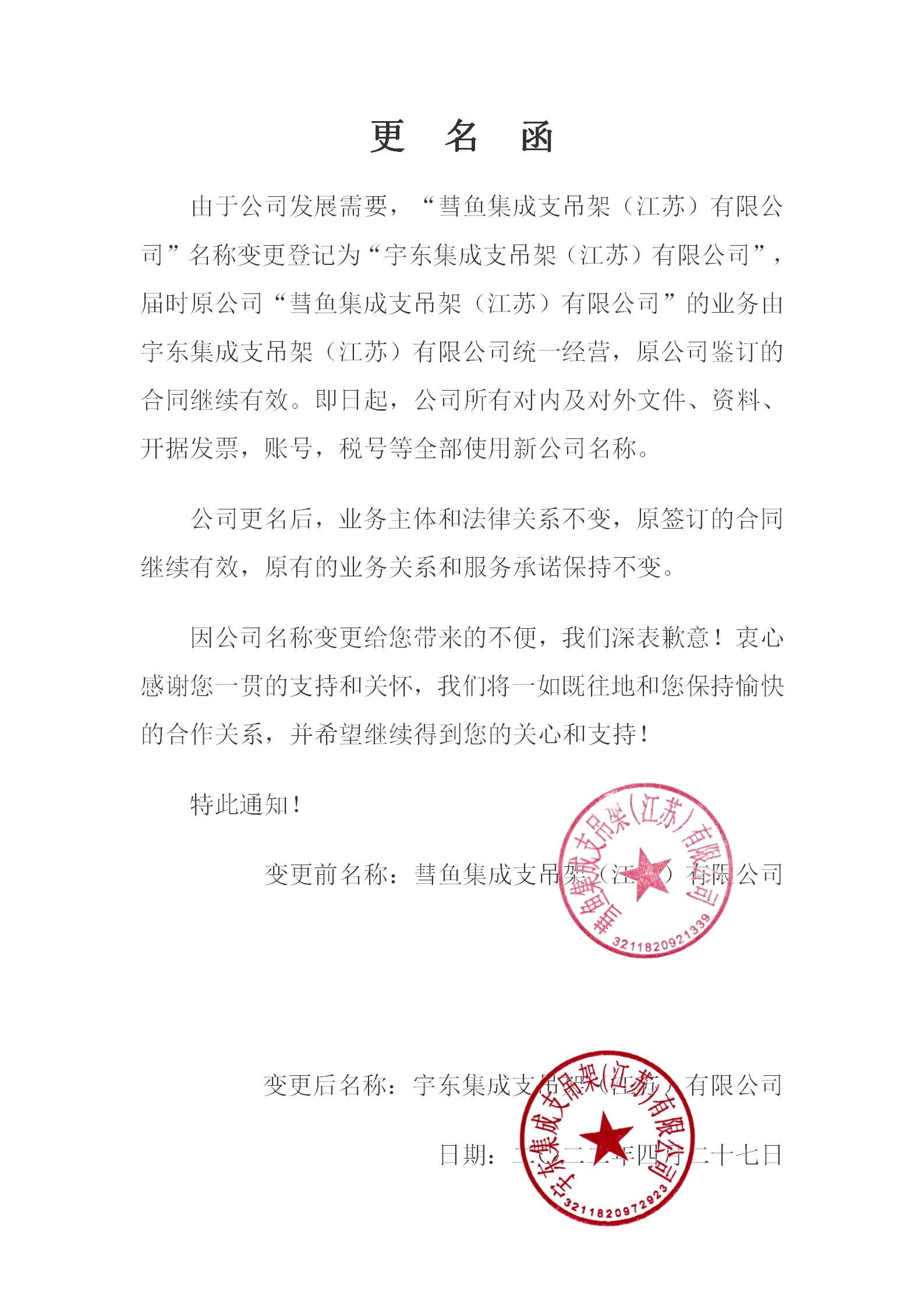 由于公司发展需要,“彗鱼集成支吊架(江苏)有限公司”名称变更登记为“公海gh555000aa线路检测集成支吊架(江苏)有限公司”,届时原公司“彗鱼集成支吊架(江苏)有限公司”的业务由公海gh555000aa线路检测集成支吊架(江苏)有限公司统一经营,原公司鉴订的合同继续有效。即日起,公司所有对内及对外文件、资料、开据发票,账号,税号等全部使用新公司名称。